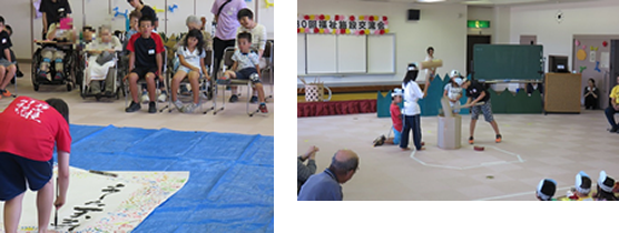 今年は30周年を記念して、みんなで手形を押して作品作り。北条高校の書道部の方が、交流会の合言葉「明日天気になぁれ」を揮毫してくれました。もちろん三愛園の精鋭による劇も披露。「おむすびころりん」頑張りました。