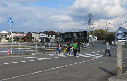 三愛園から粟井小学校への通学路に、横断歩道がないところを横断しなければならない危険な箇所がありました。